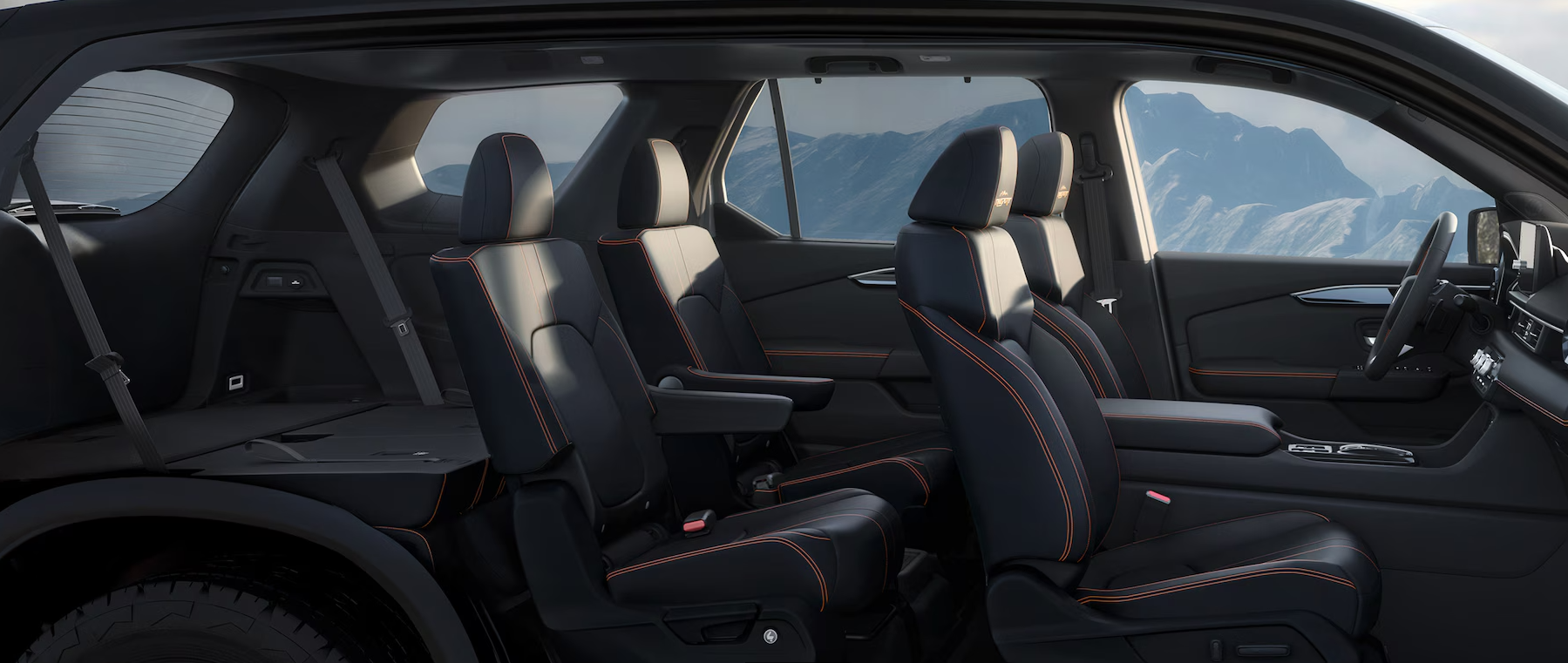 The Pilot features a powerful, rugged exterior and a spacious, fully loaded cabin with innovative solutions like an available stowable 2nd-row center seat. The TrailSport interior adds attitude and durability with striking orange high-contrast stitching, easy-to-clean surfaces, and all-season floor mats.